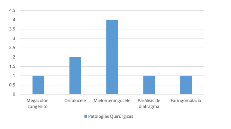 Según la muestra, cuatro pacientes presentaron Mielomeningocele, siendo la patología quirúrgica más común, seguida del de diafragma y faringomalacia.