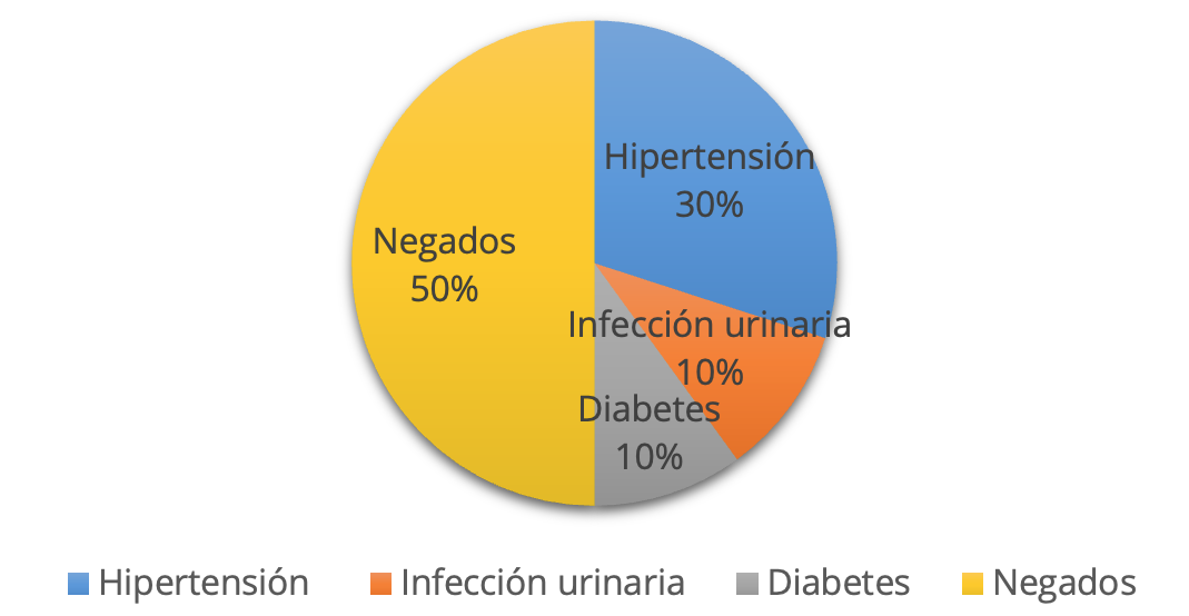 Los antecedentes maternos en un 50 % fueron negados, un 30 % padecía hipertensión, un 10 % tuvo infección urinaria durante el embarazo y el otro 10 % padece de diabetes.