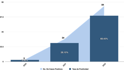 En cuanto a la circulación estacional del VSR, se obtuvo que tanto en el 2020 como el 2021 hubo una mayor prevalencia de casos en la temporada octubre-diciembre, mientras que en el 2022 se reportó un incremento exponencial de julio-septiembre (Véase Figura 4).