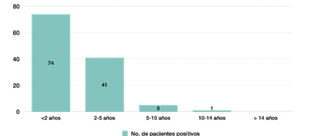 En cuanto a los datos obtenidos según los grupos etarios, los pacientes que mayor prevalencia tuvieron del VSR fueron los menores de 2 años con un 61.2 % (n= 74), mientras que los pacientes entre 2-5 años tuvieron una prevalencia del 33.9 % (n = 41), los pacientes entre 5-10 años un 4.1 % (n = 5) y los pacientes de 10-14 años un 0.8 % (n = 1). No hubo casos reportados para los pacientes mayores de 14 años (véase Figura 2).