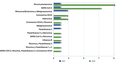 Las coinfecciones detectadas fueron de 1 a 4 virus adicionales al VSR. Se destaca un (1) caso en el 2022 con cuatro (4) detecciones de virus adicionales al VSR, siendo estos: SARS-CoV-2, rinovirus, parainfluenza 2 y coronavirus OC43. También, se distinguen las coinfecciones de SARS-CoV-2, teniendo una prevalencia del 29.41 %.