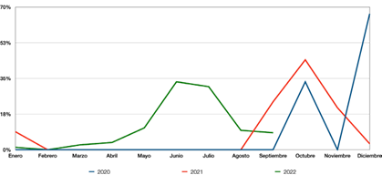 Tanto en el 2020 como en el 2021 la temporada con mayor incidencia de VSR fue octubre-diciembre, mientras que en el 2022 la temporada con mayor incidencia fue julio-septiembre. Estos datos coinciden con lo evidenciado en la bibliografía, debido a que el VSR tiende a presentarse en los países tropicales durante la temporada de lluvia y/o en épocas de invierno 24.