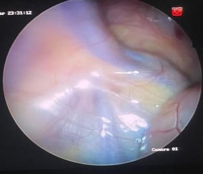 El abordaje inicial laparoscópico se realiza mediante acceso umbilical abierto e introducción de trocar umbilical de 10 mm, con neumoperitoneo 12 mmHg, 5 L/min. Luego introducimos cámara y realizamos laparoscopia de cavidad, observamos el anillo inguinal interno izquierdo cerrado y anillo inguinal interno derecho permeable. Posteriormente, se introdujo hilo prolene 2.0 en la aguja epidural en forma de una lazada (primer hilo) en región inguinal derecha de manera percutánea (véase figura 3), se bordeó el anillo atravesando el peritoneo (figura 4). Se retiró la aguja dejando el hilo en forma de lazada en cavidad, después se introdujo, del mismo modo, material prolene 2.0 (segundo hilo) en forma simple, para localizar la lazada e introducir ese hilo en la lazada (figura 5). Se retiró aguja y, a través de la lazada, al extraer el hilo en forma de lazada, se rescató el segundo hilo que efectuó el cierre del anillo inguinal interno (figura 6), realizándose cierre del defecto por técnica de PIRS. Por último, el defecto aponeurótico en región umbilical se suturó con Vicryl 2-0.