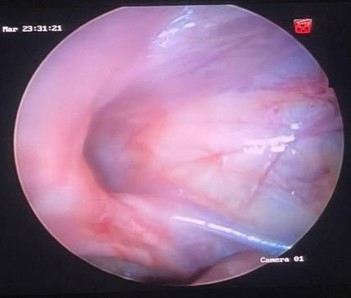 Nota: se retira la aguja dejando el hilo en cavidad, se introduce de igual forma material prolene 2.0 (2do hilo) en forma simple para localizar la lazada e introducir ese hilo en la lazada.