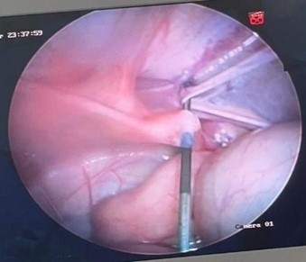 Figura 3. Introducción de aguja epidural con hilo prolene 2.0, en forma de lazada, de manera percutánea, en región inguinal derecha