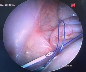 Nota: se retira aguja, y a través de la lazada al extraer el hilo en forma de lazada, se rescata el segundo hilo que va a hacer el cierre del anillo inguinal interno.