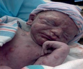 Figura 1. Paciente recién nacido con nódulos rojos/violáceos en la cara, brazo y tórax