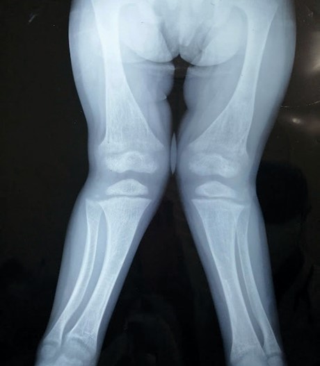Deformidad en valgo con presencia de alteración de la morfología de las metáfisis femorales, tibiales y en ambos peronés en forma de copa, con disminución de la densidad ósea principalmente en 1/3 distal de ambos fémures en relación con desmineralización de estos. Disminución de la amplitud de la línea de crecimiento a nivel femoral y tibial con visualización de los núcleos de osificación femorales, tibiales y peroneos disminuidos de tamaño.