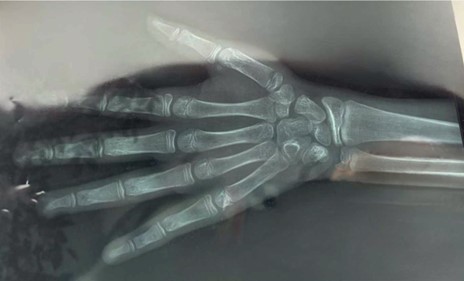 Figura 1. Radiografía de mano izquierda, atención edad ósea (13 años)