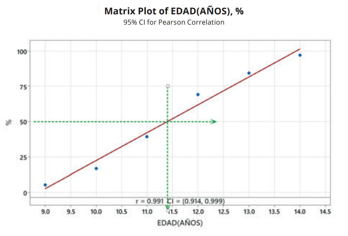 Evaluamos 3,423 niñas con edades entre 9 y 14 años (Tabla 1). De estas 1,803 (52.67 %) ya habían presentado su menarquia y 1,620 (47.32 %) aún no (Tabla 2). La edad de la menarquia por el método del statu quo se sitúa entre los 11 años (39.33 %) y los 12 (68.29 %). En 11.39 años, según la Figura 1, para la población general.