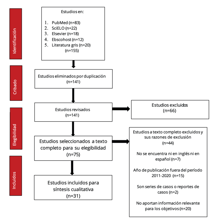 La selección de estudios se realizó en cuatro fases. Durante la primera fase de la revisión sistemática, se llevó a cabo un proceso de recopilación de artículos y se recolectó un total de 155 estudios relacionados con el síndrome de Down y las cardiopatías congénitas. En la segunda, se realizó la revisión de los artículos previamente recolectados en la primera fase, con la finalidad de eliminar duplicados y artículos que no cumplieran con los criterios de exclusión e inclusión anteriormente planteados. Dentro de los 155 artículos recolectados fueron identificados un total de 14 duplicados, procediendo inmediatamente a la eliminación de estos. Al aplicar los criterios anteriormente mencionados, se reportaron 75 artículos incluidos y 66 artículos excluidos. En la tercera fase fueron aplicados los criterios de elegibilidad y fueron reportados 51 artículos incluidos y 24 artículos excluidos. Posteriormente, en la cuarta fase, se realizó la selección final de los artículos que estarían incluidos en la investigación atendiendo a los criterios establecidos en las fases anteriores y, del mismo modo, aquellos con mayor nivel de relevancia científica. Al término de esta fase, se reportaron 31 artículos incluidos y 20 artículos excluidos.