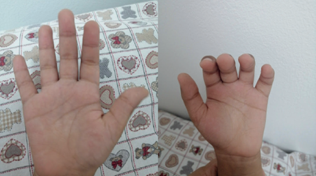 Por otro lado, en cuanto a la exploración física (véanse figuras 1-3), se evidencia retraso pondoestatural, deterioro neurológico, diámetro bifrontal ligeramente estrecho, hipertelorismo, epicanto, telangiectasias oculares en ambos ojos, sialorrea y disartria; cardiovascular normal, con estertores roncus bilaterales en ambos campos pulmonares, telangiectasias en ambas palmas de las manos, máculas hipo e hipercrómicas residuales en piel generalizados, marcha atáxica, con ligera rotación de los pies, fuerza muscular disminuida (4/5) y sensibilidad conservada.