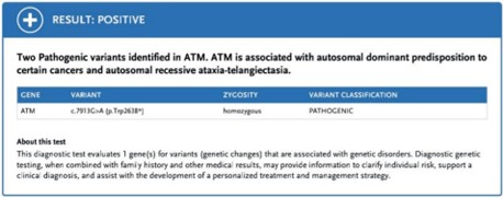 Figura 4. Prueba genética molecular (secuenciación gen ATM). Variante patogénica en homocigosis asociado con diagnóstico de ataxia-telangiectasia autosómica recesiva.